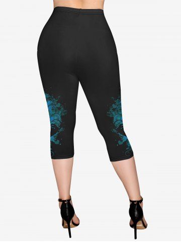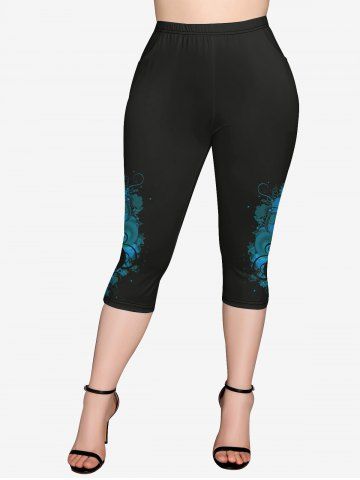 Plus Size Flower Heart Glitter Print Pockets Capri Leggings - Black - 6x