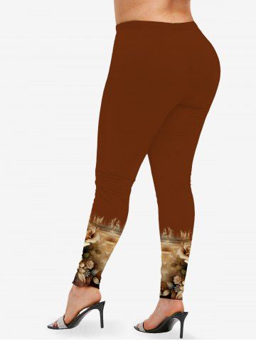 Plus Size Flower Leaf Print Leggings - Coffee - 2x