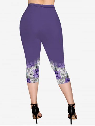 Plus Size Flower Print Pockets Capri Leggings - Purple - 4x