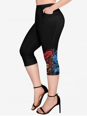 Graphic Leggings > Plus Size Flower Print Pockets Capri Leggings