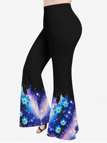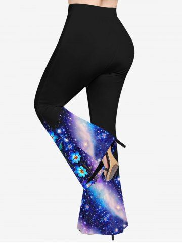 Plus Size Flowers Galaxy Stars Glitter Sparkling Sequin 3D Print Flare Disco Pants - Deep Blue - 5x