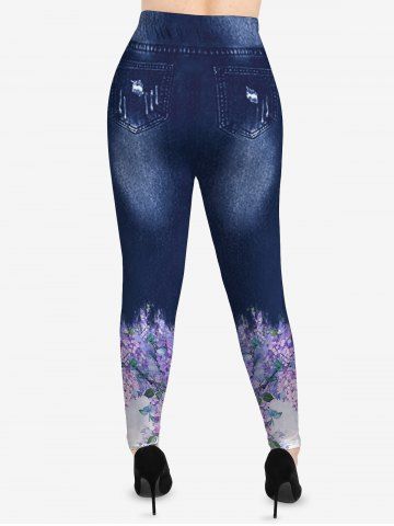 Plus Size Flowes Leaf Watercolor Painting Pockets Denim 3D Print Leggings - Purple - 1x