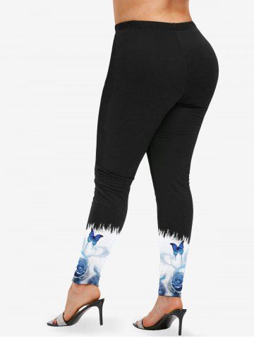 Plus Size Flowing Water Rose Flower Butterfly Print Skinny Leggings - Black - 2x