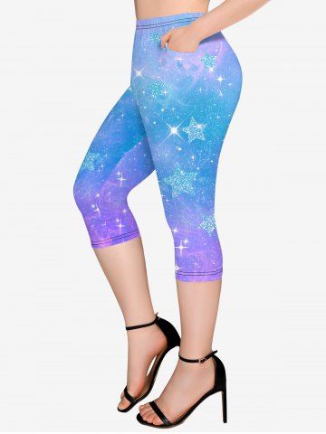 Plus Size Galaxy Star Glitter Ombre Print Pockets Capri Leggings - Light Purple - L