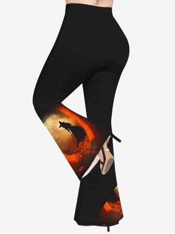 Plus Size Halloween Pumpkin Witch Print Flare Pants - Black - S