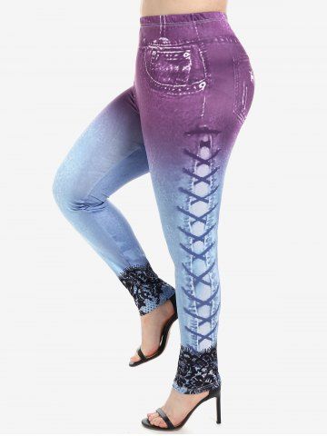 m*****353D Ripped Denim Print T-shirt and High Waist 3D Denim Lace Print Jeggings Plus Size OutfitColor: PURPLEI love the material super cute I guess the next thing I ordered I'm going to order a large an ordered extra large this time and it's just a little too big but feels really well