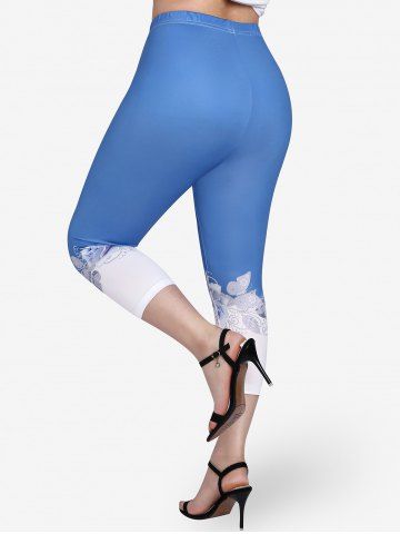 Plus Size High Waist Floral Print Colorblock Capri Leggings - Blue - 5x | Us 30-32