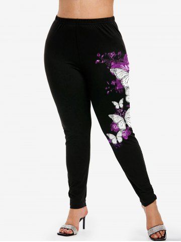 Plus Size High Waist Flower Butterfly Print Skinny Leggings - Purple - 1x | Us 14-16