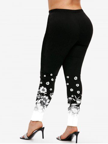 Plus Size High Waist Monochrome Floral Print Colorblock Leggings - Black - 3x | Us 22-24