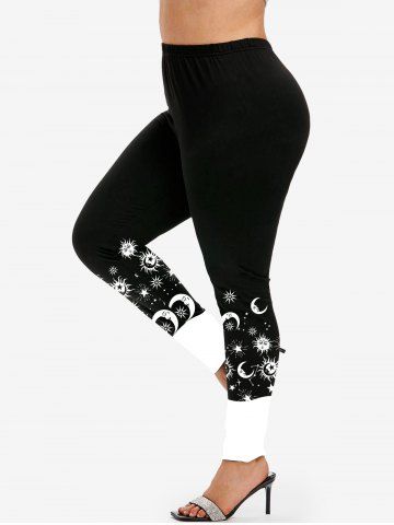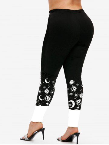 Plus Size High Waist Sun Moon Print Colorblock Skinny Leggings - Black - L | Us 12