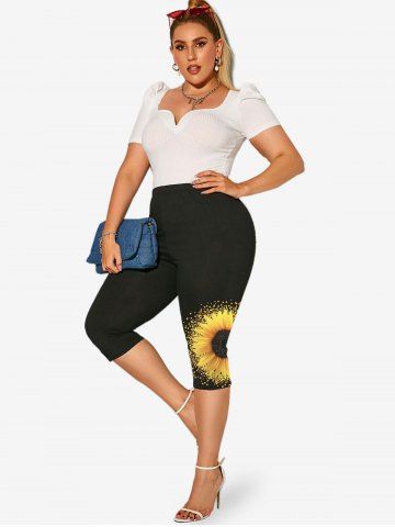 Graphic Leggings > Plus Size High Waist Sunflower Print Capri Leggings