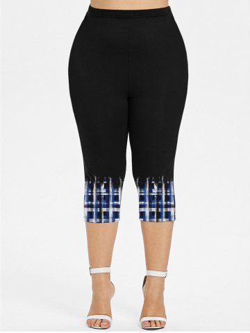 Plus Size Ink Painting Geometric Plaid Print Capri Leggings - Black - 2x