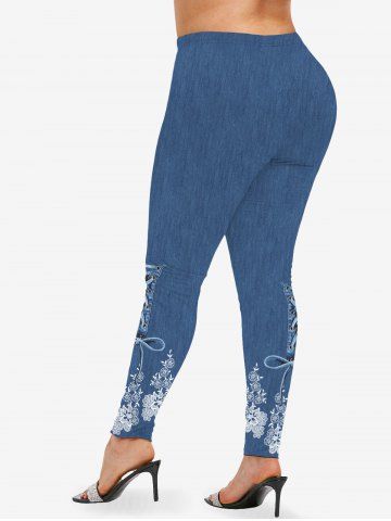 Plus Size Lace Up Floral Dnim 3D Print Leggings - Blue - 6x