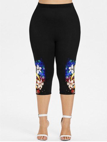 Plus Size Lily Rose Flower Music Symbol Galaxy Print Capri Leggings - Black - 4x
