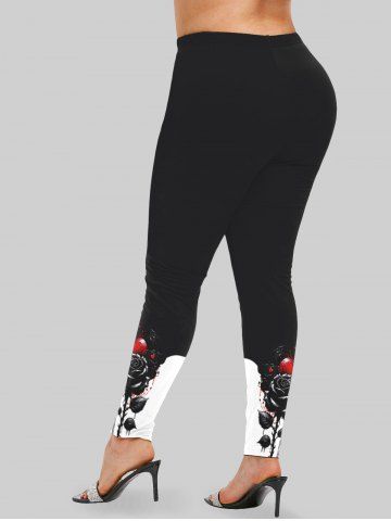 Plus Size Paint Dripping Rose Flower Heat Colorblock Print Leggings - Black - 6x