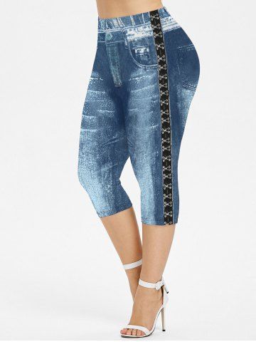 Graphic Leggings > Plus Size Pockets Grommets Buckles Distressed Denim 3D Print Capri Leggings