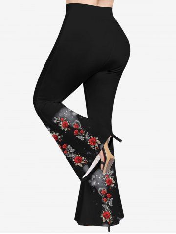 Plus Size Rose Flower Butterfly Heart Light Spot Print Valentines Flare Pants - Black - 4x