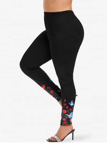 Plus Size Rose Flower Glitter Butterfly Print Skinny Leggings - Black - 2x