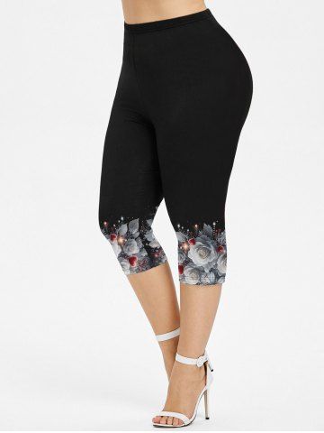 Plus Size Rose Flower Leaf Heart Glitter 3D Print Capri Leggings - Black - S