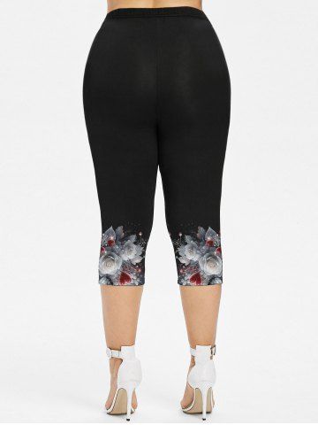 Plus Size Rose Flower Leaf Heart Glitter 3D Print Capri Leggings - Black - 3x