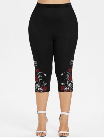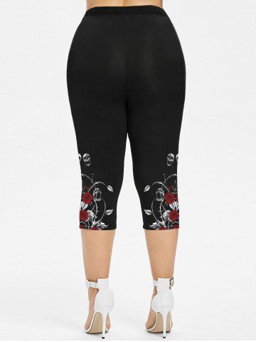 Plus Size Rose Flower Leaf Print Capri Leggings - Black - S