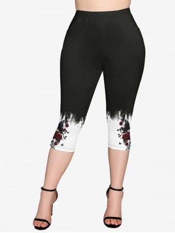 Plus Size Rose Flower Leaf Vine Butterfly Print Capri Leggings - Black - S