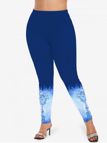Plus Size Rose Flower Tie Dye Colorblock Print Leggings - Blue - 2x