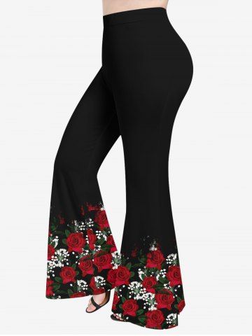 Plus Size Rose Flowers Leaf Print Flare Pants - Red - 2x