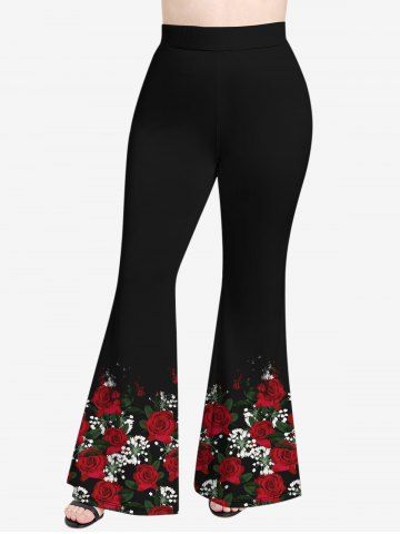 Graphic Leggings > Plus Size Rose Flowers Leaf Print Flare Pants