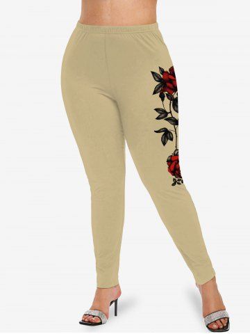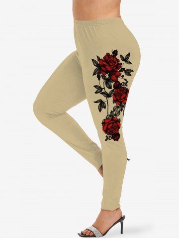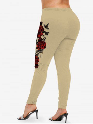 Plus Size Rose Flowers Leaf Print Leggings - Light Coffee - Xs