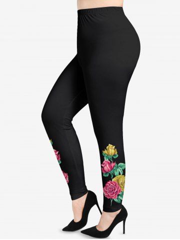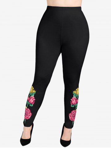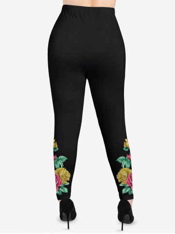 Plus Size Rose Flowers Leaf Print Leggings - Black - 5x