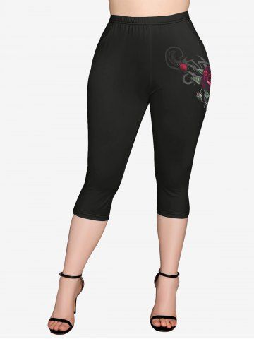 Graphic Leggings > Plus Size Rose Leaf Print Pockets Capri Leggings