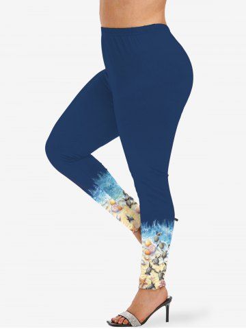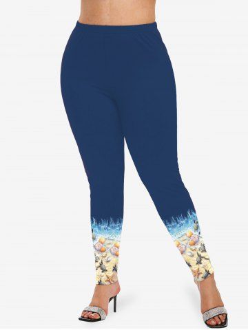 Plus Size Sea Beach Shell Starfis Turtle Print Leggings - Deep Blue - 3x