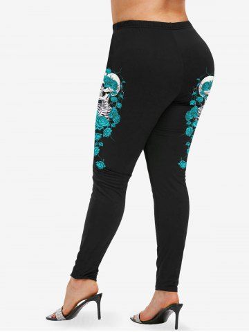 Plus Size Skeleton Lovers Rose Flower Heart Print Skinny Leggings - Blue - Xs