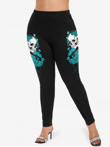Plus Size Skeleton Lovers Rose Flower Heart Print Skinny Leggings - Blue - 3x