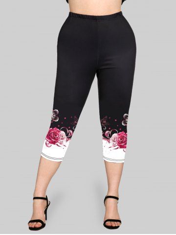 Graphic Leggings > Plus Size Two Tone Rose Butterfly Printed Capri Leggings