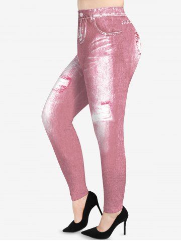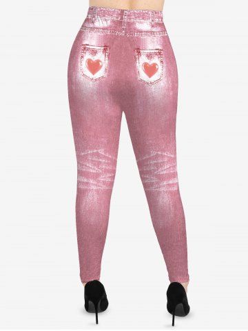 Plus Size Valentine's Day Heart Pockets Distressed Denim 3D Print Leggings - Light Pink - 1x