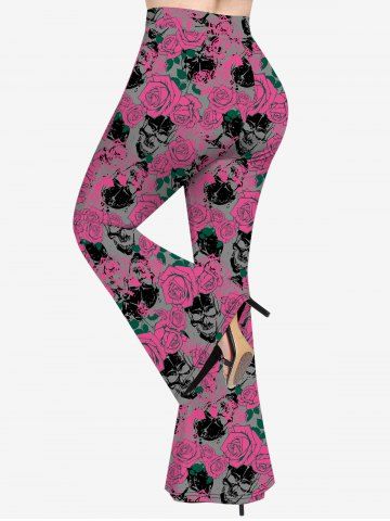 Graphic Leggings > Plus Size Valentine's Day Skulls Rose Flowers Leaf Print Flare Pants