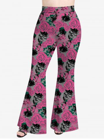 Plus Size Valentine's Day Skulls Rose Flowers Leaf Print Flare Pants - Light Pink - 3x