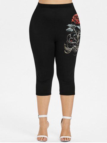 Plus Size Vintage Rose Leaves Print Capri Leggings - Black - S