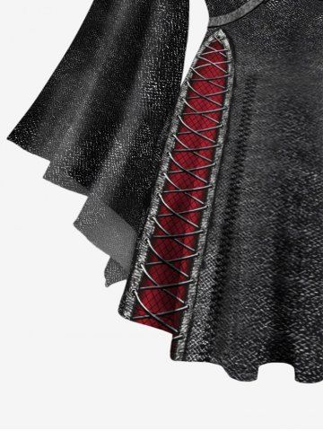 Plus Size Buckles Fishnet Lace Up Braided Denim 3D Print Lattice Crisscross Flare Sleeve Top - Black - L