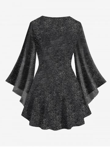 Plus Size Buckles Fishnet Lace Up Braided Denim 3D Print Lattice Crisscross Flare Sleeve Top - Black - 5x