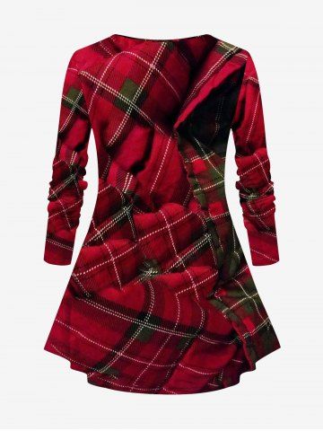 Plus Size Cat Plaid Quilt 3D Print Long Sleeve T-shirt - Deep Red - 2x