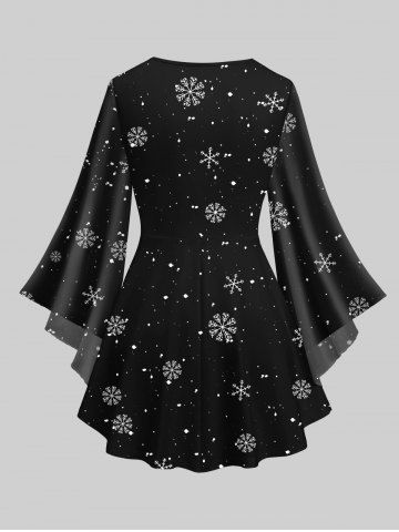 Plus Size Christmas Snowflake Street Lamp Santa Clause Bear Print Lattice Crisscross Flare Sleeve T-shirt - Black - 1x