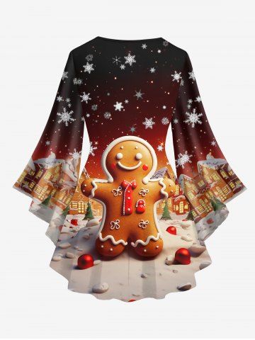 Graphic Long Sleeves > Plus Size Christmas Tree Ball Snowflake Gingerbread House Colorblock Print Lattice Crisscross Flare Sleeve Top