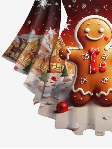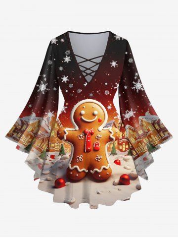 Plus Size Christmas Tree Ball Snowflake Gingerbread House Colorblock Print Lattice Crisscross Flare Sleeve Top - Deep Red - M