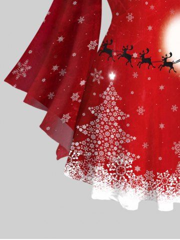 Plus Size Christmas Tree Santa Claus Elk Snowflake Moon Printed Flare Sleeve Lattice T-shirt - Deep Red - Xs