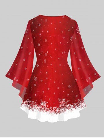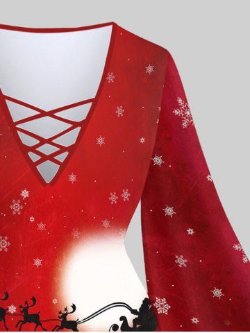 Plus Size Christmas Tree Santa Claus Elk Snowflake Moon Printed Flare Sleeve Lattice T-shirt - Deep Red - 5x