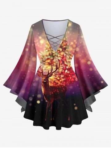 Plus Size Christmas Tree Snowflake Elk Sparkling Sequin Glitter 3D Print Lattice Crisscross Flare Sleeve T-shirt - Multi-a - 3x