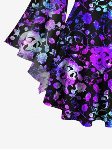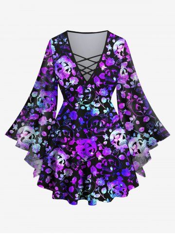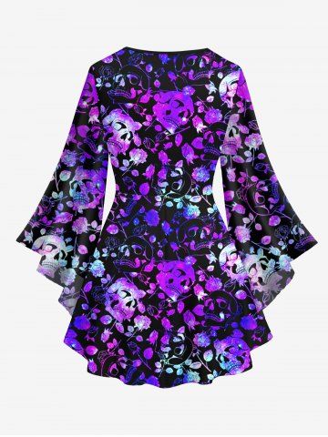 Plus Size Flare Sleeves Glitter Colorful Skulls Rose Flower Leaf Print Ombre Lattice Top - Purple - 5x
